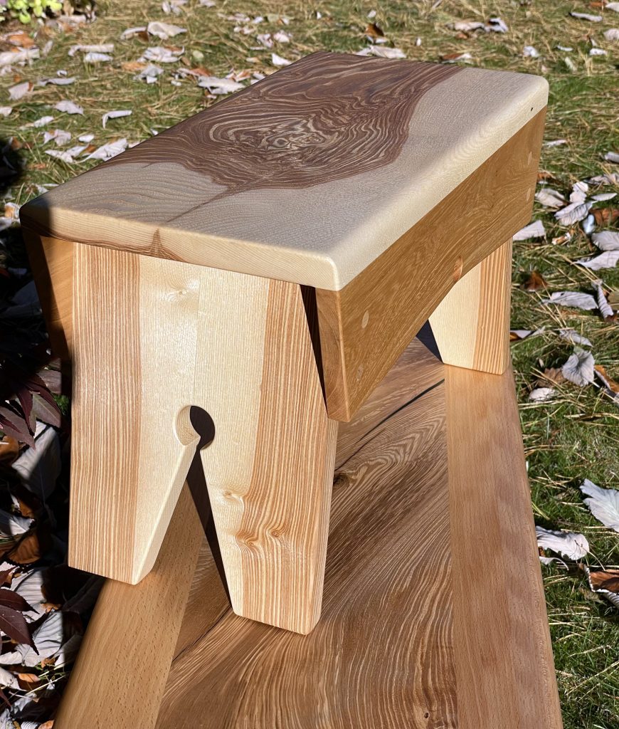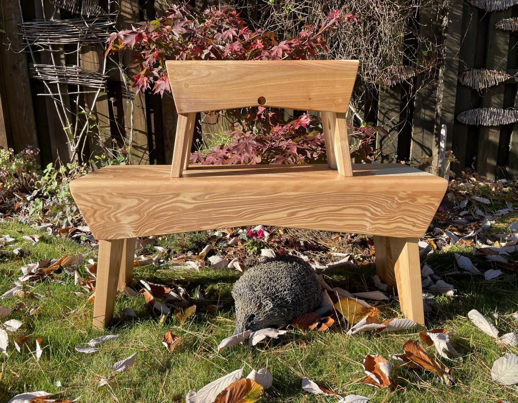 Back to this most recently completed creepie: it features ash legs with traditional key-hole shaped cut-outs and as a new variation I have added an enclosed circular cut-out in the elm side-skirts. The size of this creepie is identical to my earlier Wedding Creepie (height 280 mm, width 230 mm, length 450 mm) and in the photos here it is sitting on top of my Bench Creepie (height 420 mm, width, 340 mm, length 910 mm). I hope you like it. My next post will not be a creepie and is likely to be a Corncrake dining table and something related…